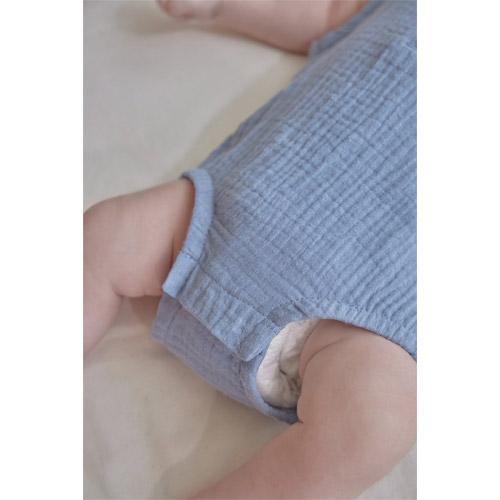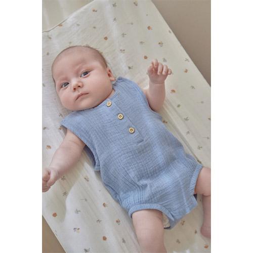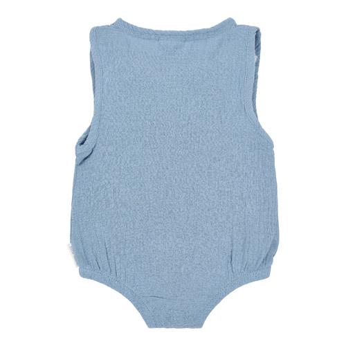 Deze mouwloze romper in zachtblauw is heerlijk luchtig voor warme dagen.
