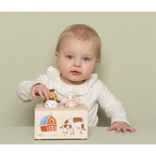 Het stevige houten doosje van dit interactieve pop-up speelgoed is versierd met vriendelijke illustraties van Little Farm, ontworpen om de verbeelding van jouw kleintje te prikkelen.
