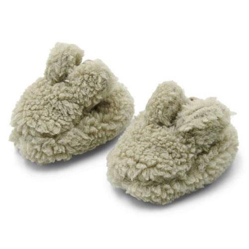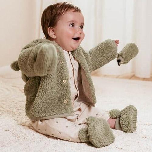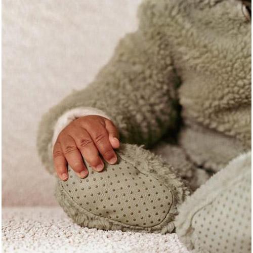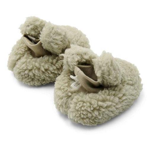 Made from soft and warm teddy material in a soft green color, they are lined with organic cotton with a playful print of little leaves on the inside.