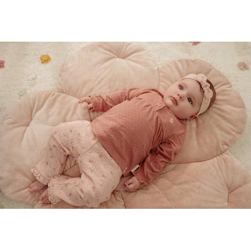 The intricate pointelle structure of the fabric, in a lovely light shade of pink, is adorned with a delightful print of petite flowers.