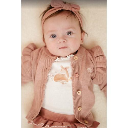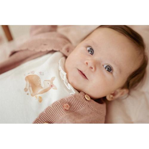 Made from soft organic cotton, it features a delightful scene from the Fairy Garden, where a deer enjoys the beauty of the surrounding flowers. Adding a touch of sweetness, delicate ruffles adorn the neckline.