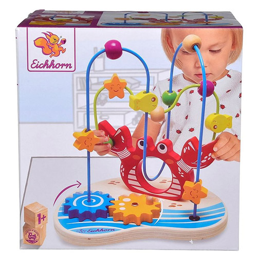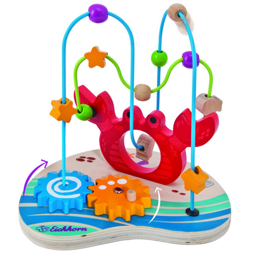 The colourful beads can be slid onto the loops. The spiral game has two loops.