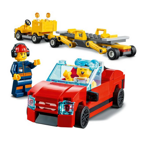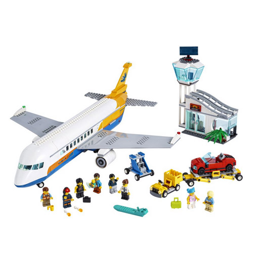 Accessories included: large plane, an airport truck with car lift, a passenger stairs, an airport terminal, a red convertible, 8 minifigures and a figure of a baby.