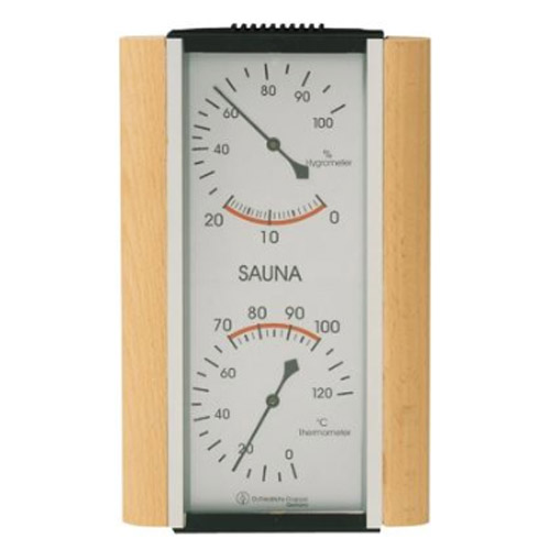 Luxury sauna thermo/hygrometer in wooden/stainless steel frame.