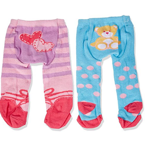 In the set you will find a pair of pink tights with purple stripes and cute pink hearts and the other pair are blue with polka dots and a cute bear.