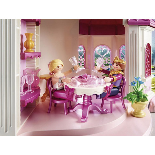 The playset contains two Playmobil figures : Princess Betty and her mother, a princess castle with three rooms, a throne room with throne, a small banqueting hall with table and chairs, glasses an carafe, and a tower room with ottoman.