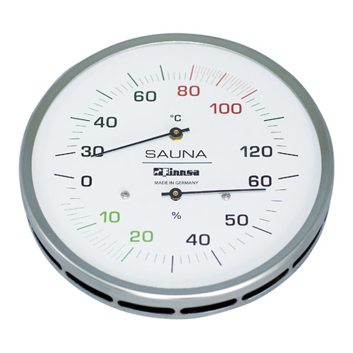Sauna measuring range: in contrasting colours (thermometer red and hygrometer green.)