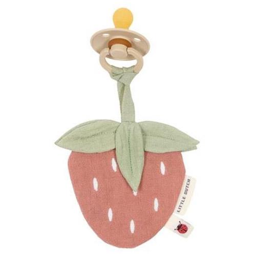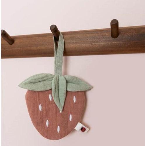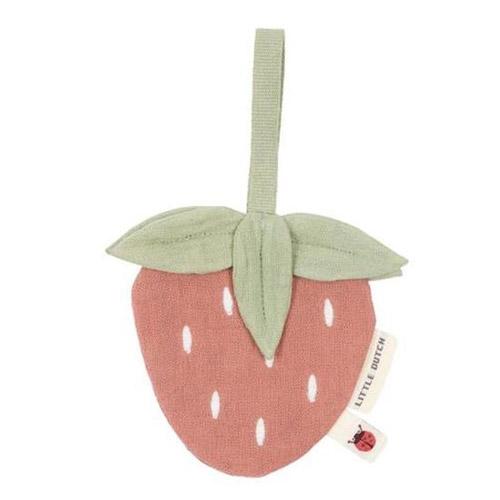 The cloth is shaped like a cute strawberry, pink with white seeds and green petals.