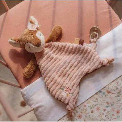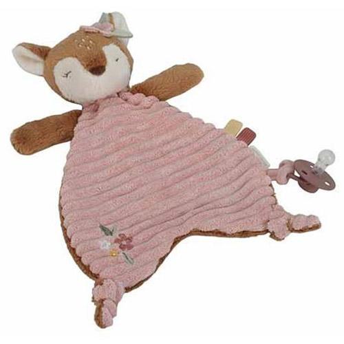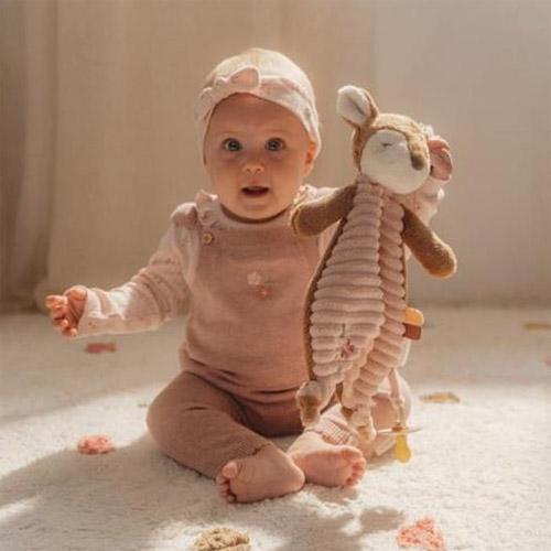 The body of the deer is a wonderfully soft cloth with playful labels, a Fairy Garden embroidery and two buttons that are easy for little hands to grab.