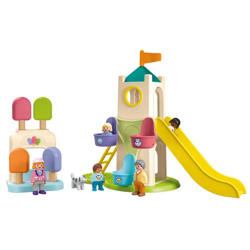 - Play tower with ladder, playhouse, slide, and Ferris wheel with a swing function. The crank sets the Ferris wheel in motion, while a plate in the adventure tower simultaneously shakes a seated figure toward the slide.