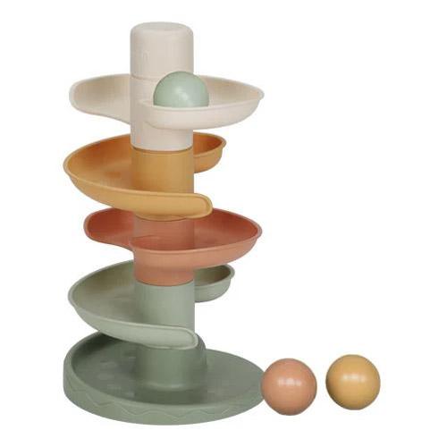 The Spiral Tower comes with 3 lightweight, easy-to-grasp balls in different colors that make a sound when moved.