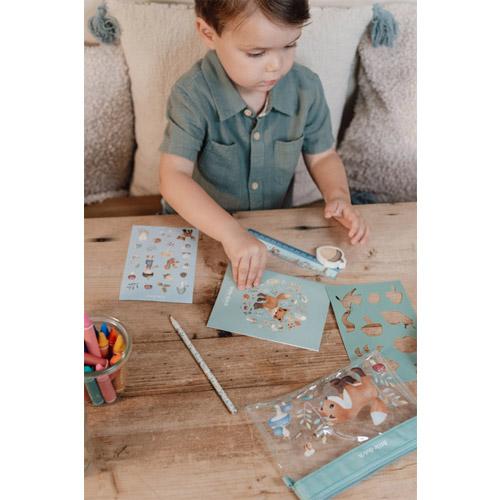 The pencil case contains a cute notebook decorated with sweet forest animals, a colorful sticker sheet to brighten up each creation and a sturdy ruler to make straight lines.