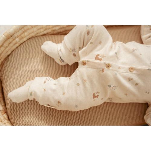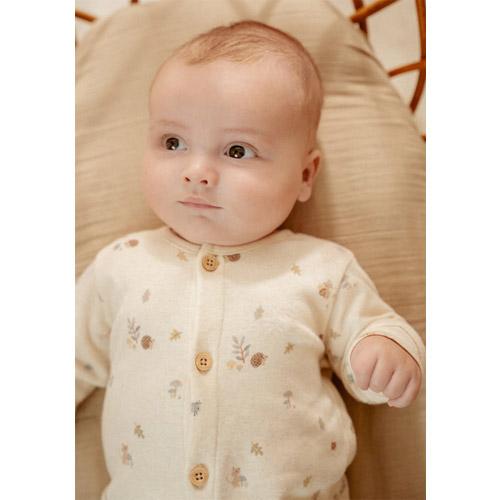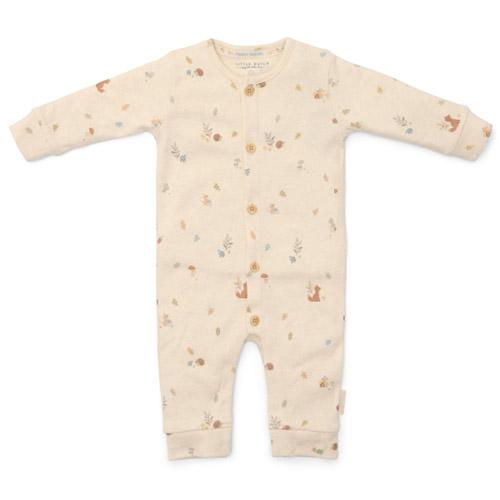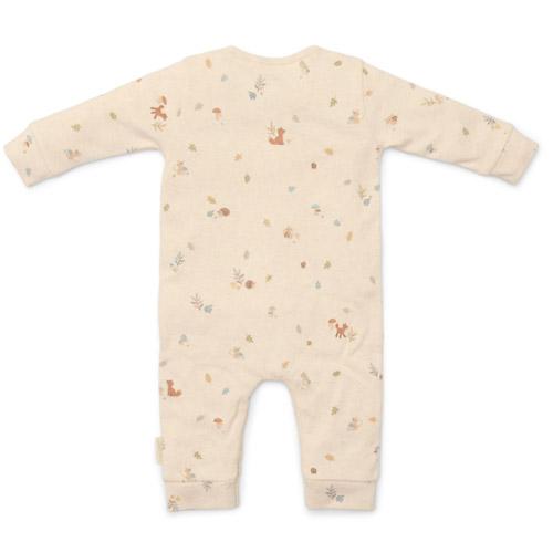 Cette adorable combinaison une pièce dans un mélange beige sable arbore l'imprimé enchanteur Forest Nature avec d'adorables petits renards entourés d'une forêt remplie de champignons et de feuilles.