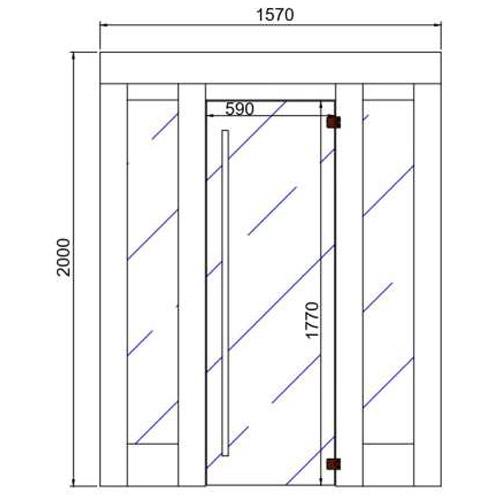 - Getinte veiligheidsglasfront met deur 1770 x 590 x 8 mm inclusief bruine scharnieren / red ceder handvat en 2 zijruiten in 8 mm gehard glas.