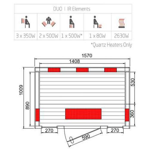 - Duo infraroodstralers met bevlokte rooster en draaibare stralers in de voorwanden, vloerverwarming.