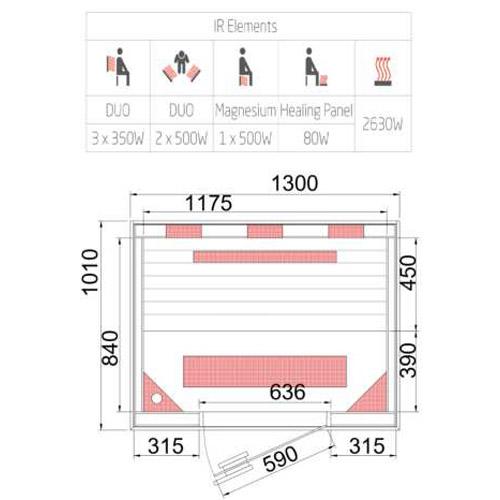 - Duo stralers in de voor- en achterwand, magnesium straler voor de benen en vloerverwarming.