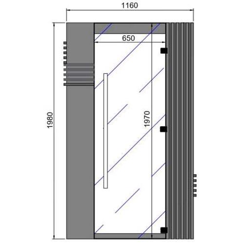 - Heldere deur uit veiligheidsglas 1970 x 650 x 8 mm met gelakt hang en sluitwerk in overeenstemming met de MDF kleur.