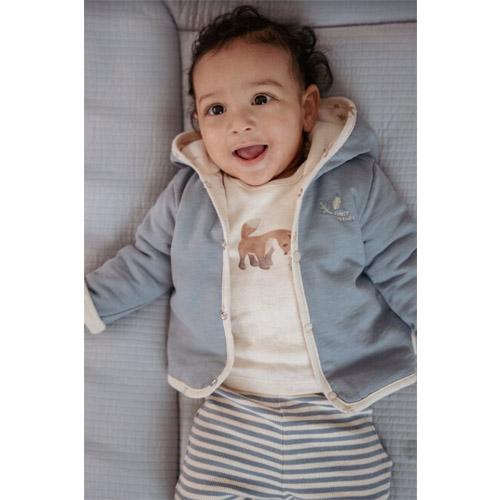 Gemaakt van biologisch katoen, licht gewatteerd met een drukknoopsluiting, zorgt deze omkeerbare jas zowel voor comfort als geborgenheid voor je pasgeboren kindje.