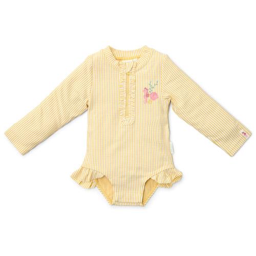 Dit badpak met lange mouwen heeft een fijn dessin van gele en witte streepjes versierd met een schattig roze zeepaardje als detail.