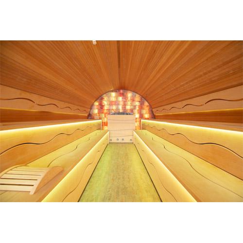 Achterwand afgewerkt met ruwe zoutstenen met indirecte verlichting.