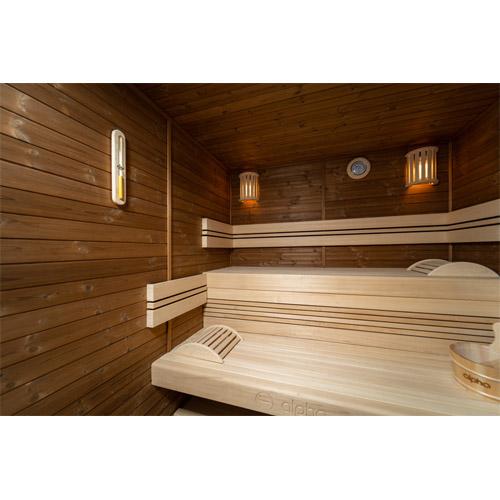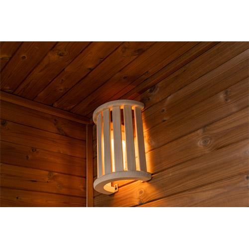 De saunacabine bevordert de bloedsomloop en de ademhaling, vervaardigd uit duurzaam hout.