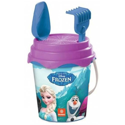 Ideaal om te spelen op het strand of thuis in de zandbak is dit Frozen strand speelgoedset.Bestaat uit een emmer, gieter, zeef, schopje, rakel en twee vormpjes.Diameter: 16 cm.