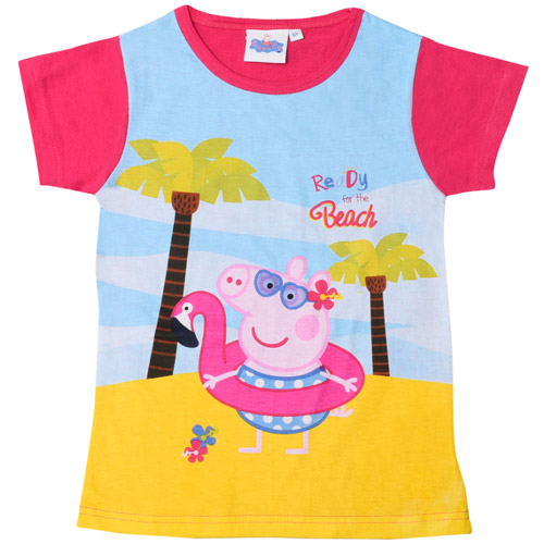 Donkerroze T-Shirt van Peppa Pig, met een afbeelding van Peppa op het strand aan de voorkant.