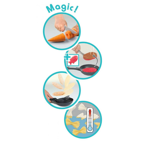 De stevige speelkeuken beschikt over een oven met afneembaar rooster, een koelkast met een mechanische ijsblokmachine, een kooktoestel met bubbelwaterfunctie waarbij het water met een druk op de knop borrelt, een spoelbak met waterkraan met popfunctie en een afzuigkap met geïntegreerde espressomachine en diverse tabbladen.