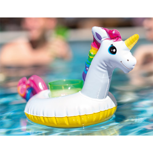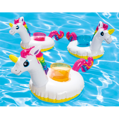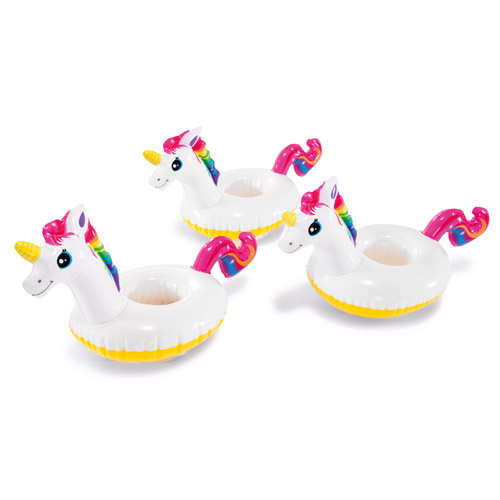 Unicorn bekerhouder.Opblaasbare drinkbeker in de vorm van een unicorn vinyl.3 stuks per set.Afmeting: 41 cm x 20 cm.Leeftijd: 3 jaar.