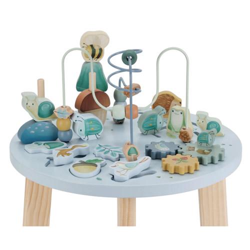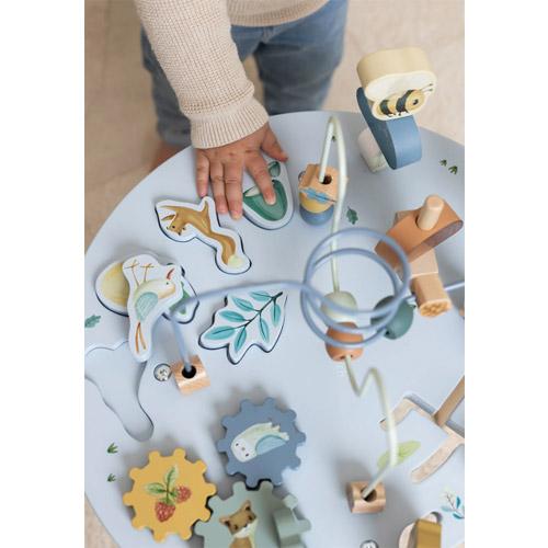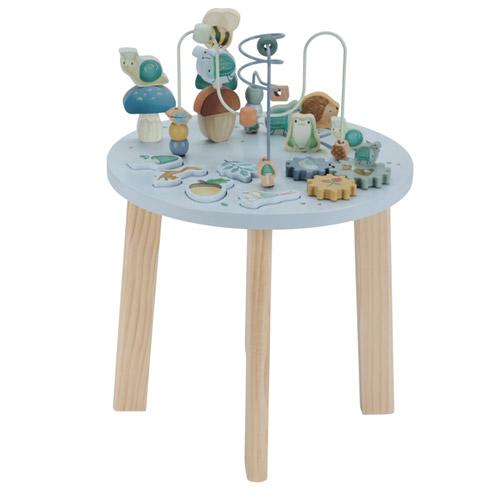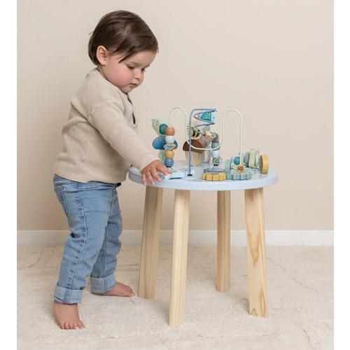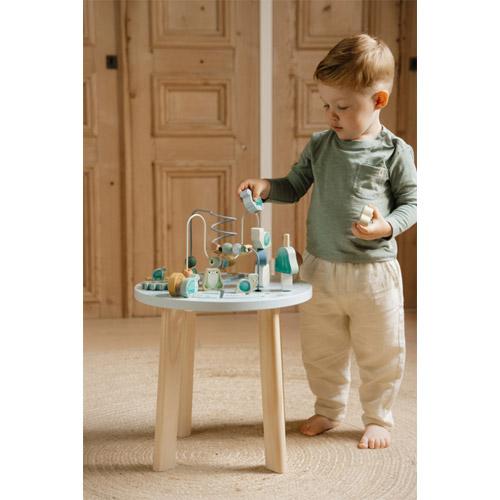Deze houten activiteitentafel daagt je kleintje op vele manieren uit.