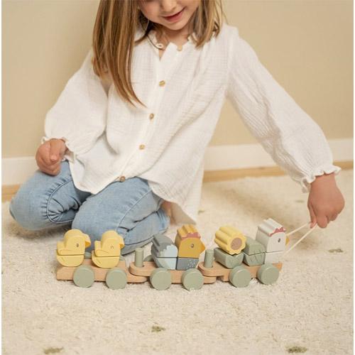 De mooie houten trein van Little Dutch is geïllustreerd met een kip en haar kuikentjes.