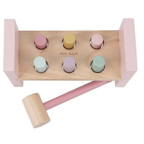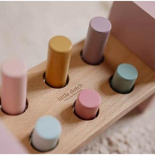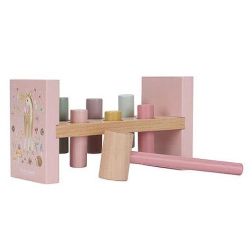 Gebruik de hamer om de 6 gekleurde staafjes in het houten hamerbankje te timmeren en verken de magie van Fairy Garden.