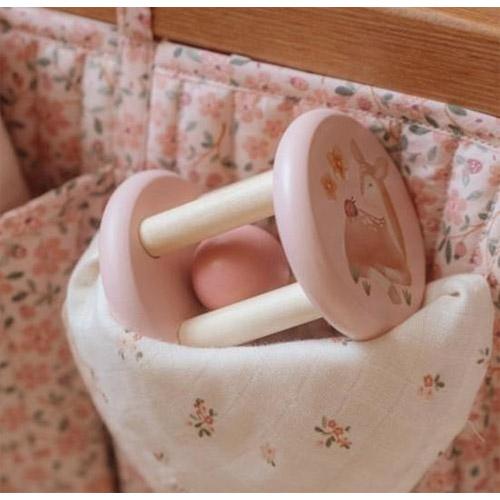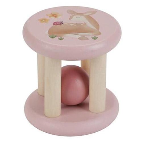 Deze schattige houten rammelaar rolt en rolt en maakt daarbij een vrolijk geluid.
