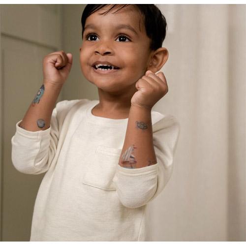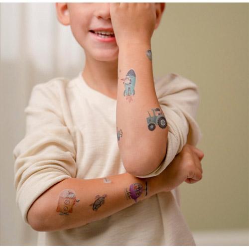 Het kleurrijke setje bestaat uit schattige tijdelijke kindertatoeages van Jim en zijn vriendjes.