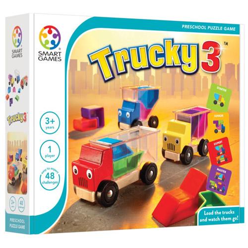 In de doos : - 3 houten vrachtwagens met doorzichtige laadbakken.