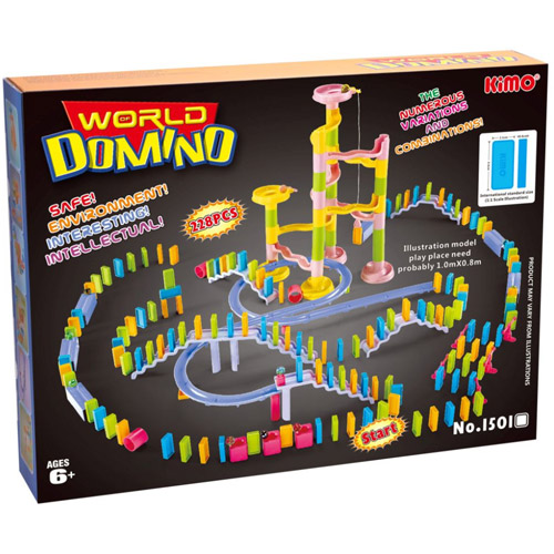 Bouw zelf de knikkerbaan en zet de dominoblokjes recht aan de voet van de knikkerbaan.