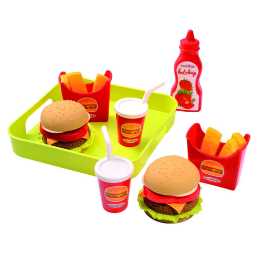 De set wordt geleverd met een dienblad, 2 hamburgers, 2 pakjes frieten, ketchup en 2 milkshakes.