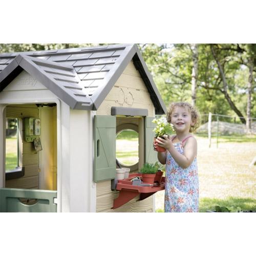 Uitgerust met 1 poort, 2 ramen met scharnierende luiken en 2 patrijspoorten, heeft het tuinhuis ook tal van speelfuncties: een grote plantenbak, een latwerk voor het ophangen van kleine potten en het vogelvoederbakje, en een vogelvanger met water met zijn gieter.