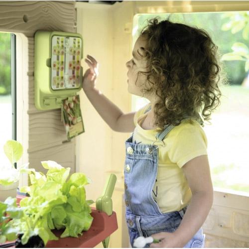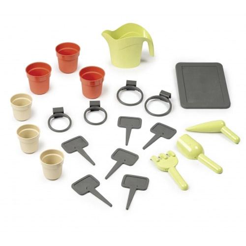 Er zijn veel accessoires inbegrepen om de speelfuncties te verbeteren: 3 gereedschappen (schep, hark, plantenbak), 6 potten, 1 lei om je beplanting te noteren, borden voor de moestuin (met een leisteenstructuur om op het krijt te schrijven) als klein tuinmansboekje met 3 clips voor het ophangen van etiketten of zaadzakjes.