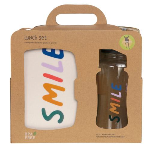 De lunchset bestaat uit een lunchbox en een drinkfles en komt uit het vrolijke design van Little Gang collectie.