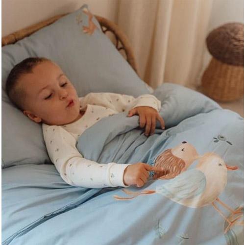 Het zachte dekbedovertrek is gemaakt van 100% biologisch katoen in een effen Denim Blue kleur versierd met een speels tafereel uit het bos.